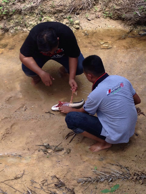 Kami berkumpul di satu lorong kecil ke ladang di bawah jalan lebuhraya LPT II. Kedatangan seorang lelaki penunjuk jalan akan mengetuai kami ke sana sejauh 6 km. Dekat sahaja jika dicongak di dalam kepala. Tapi, bila memandu sendiri dengan keadaan jalan off road (tiada jalan bertar dan hanya jalan bertanah) terasa amat jauh. Kami hanya menaiki Toyota SEG tahun 92. Dengan keadaan kereta yang agak rendah hampir rapat ke tanah, terasa seolah-olah kami menyapu batu-batu kecil. Kami terpaksa perlahankan pemanduan dan agak berhati-hati serta mata kami terkunci di jalan bagi memerhatikan batu yang meninggi. Pernah kereta kami tersangkut dek batu. 4 lelaki sado berjaya mengangkat kereta dalam temph 2 jam. Azab bila diingatkan kembali….