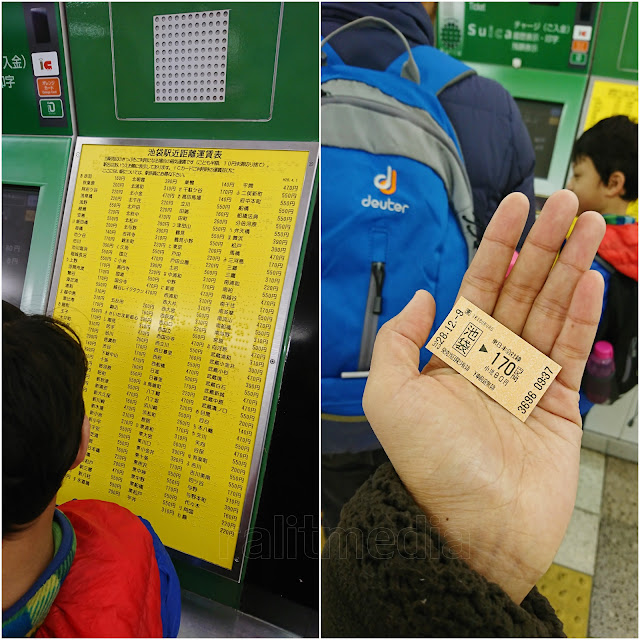 Penerangan ada gambar sebelah kiri. Full in Japan. Tapi nak mudah, tengok kat mesin. Jangan lupa tekan English. Keluarlah tiket sebesar gambar kanan. Harga 170 yen. Yang nombor bawah tu untuk harga budak 80 yen.