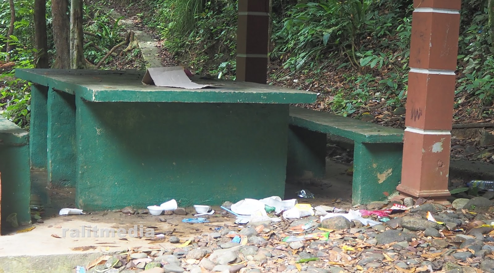 Kami sempat berpesan kepada anak-anak tidak membuang sampah merata-rata. Sayanglah dengan alam hutan yang masih terjaga. Namun, ada juga manusia yang tidak bertanggungjawab telah meninggalkan sampah dan tidak dibawa pulang. Bagi pendapat kami, pengunjung mungkin membungkus sampah. Tetapi dibiarkan di situ dan mengharapkan pekerja datang membersih. Mana ada penjaga wahai rakyat jelata. Pandai bawa ke jeram, pandai-pandailah bawa pulang semula. Sayang kerana sampah sudah bersepah…